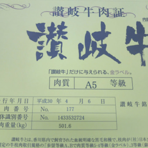 讃岐牛の定義は、香川県で飼育されたことはもちろんですが、そのほか、血統明確な黒毛和種で、肉質の15ランクの内、上位4ランクに格付けされたもの(A5、A4、B5、B4)を「讃岐牛(金ラベル)」、5・6ランクのもの(A3、B3)を「讃岐牛(銀ラベル)」としています。「讃岐牛」の場合、普通1頭の母牛からは1年に1頭しか生産されません