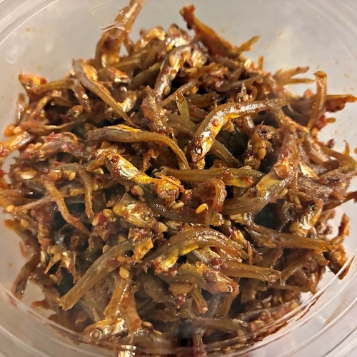 原材料名:じゃこ(韓国産)、漬け原材料(ごま油、サラダ油、みりん、唐辛子、すりニンニク、砂糖、醤油)/調味料(アミノ酸等)
