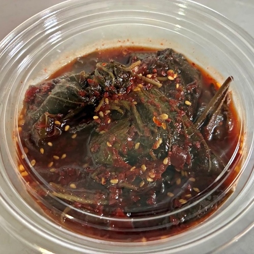 エゴマの葉(韓国産)、漬け原材料(唐辛子、酢、醤油、砂糖、ごま) |