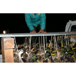 むそう網猟という方法で捕獲しています。網でとるのでカモは傷ついたりしません。