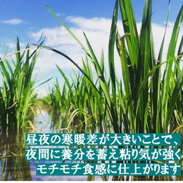 新潟県五泉市は隠れたお米の名産地と知られ、菅名岳・大蔵山・護摩堂山などに囲まれた扇状地で、阿賀野川をはじめとする水源に恵まれています。昼夜の寒暖差が大きく、夜間に養分を蓄えることで、粘り気が強くモチモチした食感のコシヒカリに仕上がります。また、米作りに使用する水は、水温が低くクリアで良質な「阿賀野川の水」。強い甘みで濃厚な味わいのお米に育ちます。